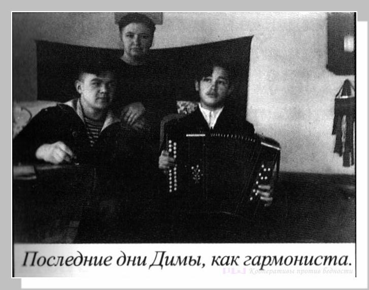 Вопрос был решён. Будущий гармонист с остервенением начал часами растягивать гармонь. Музыка давалась тяжело, но всё-таки несколько мотивов удалось быстро освоить, и через год он уже мог сыграть в местном клубе фокстрот, танго и подыграть что-нибудь пьяной компании. Времена были не богатые на музыку. На селе это была вторая гармонь, и его стали приглашать соседи и знакомые на домашние празднества, а вечером, в дни танцев, поиграть в клубе, за что завклубом пускал его бесплатно в кино. Дима первое время конфузился, учился он всего лишь в шестом классе, а на танцы ходили и его молодые учительницы, но после того как страстно желающие потанцевать парни и девушки несколько раз приводили его классную руководительницу Татьяну Петровну, и она просила Диму поиграть, он осмелел и играл уже без всяких стеснений.