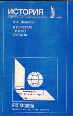 К берегам Тихого океана / Новое в жизни, науке, технике, подписная научно-популярная серия - Москва: издательство "Знание", 1989. В брошюре рассказывается о том, как русские землепроходцы и мореплаватели вышли к берегам Тихого океана на всём протяжении от Берингова пролива до Японского моря. Читатель узнает подробности экспедиций Витуса Беринга, Г.И. Невельского, Е.В. Путятина, о плавании знаменитого фрегата "Паллада".