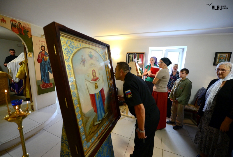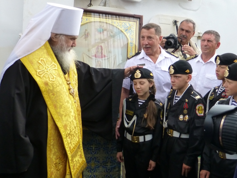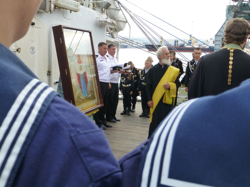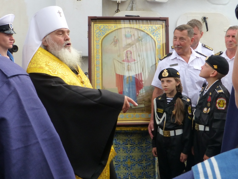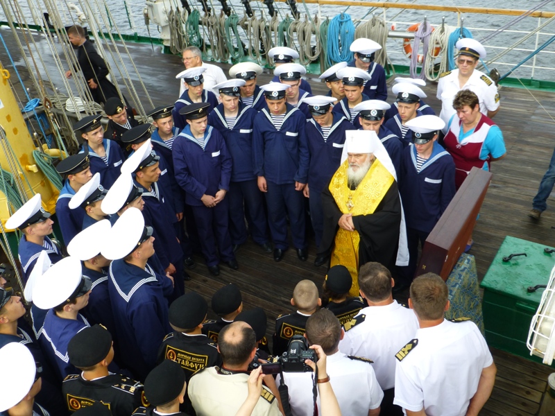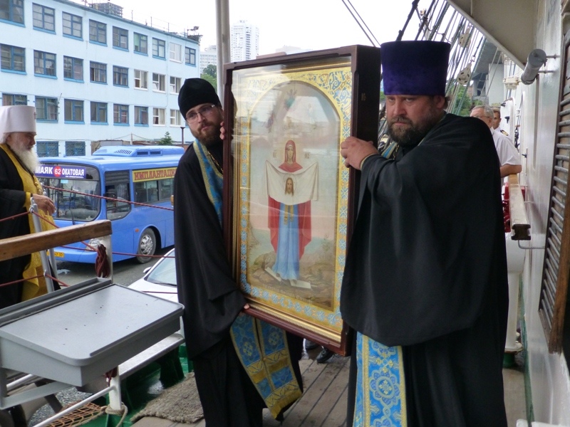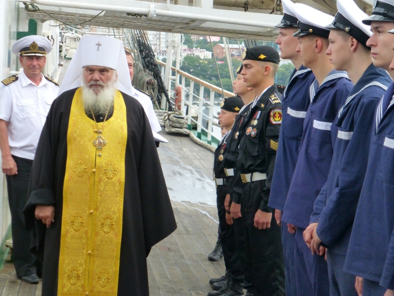 Фрегат «Паллада» с курсантами, юнгами и кадетами, священником и иконой на борту отправился в морской крестный ход. Морской поход посвящен 70-летию окончания Второй мировой войны и 110-летию окончания русско-японской войны. молебен по случаю отправки морского Крестного хода. Торжественное богослужение в часовне на месте будущего Порт-Артурского Морского храма и проводы иконы в поход провел митрополит Владивостокский и Приморский Вениамин. |