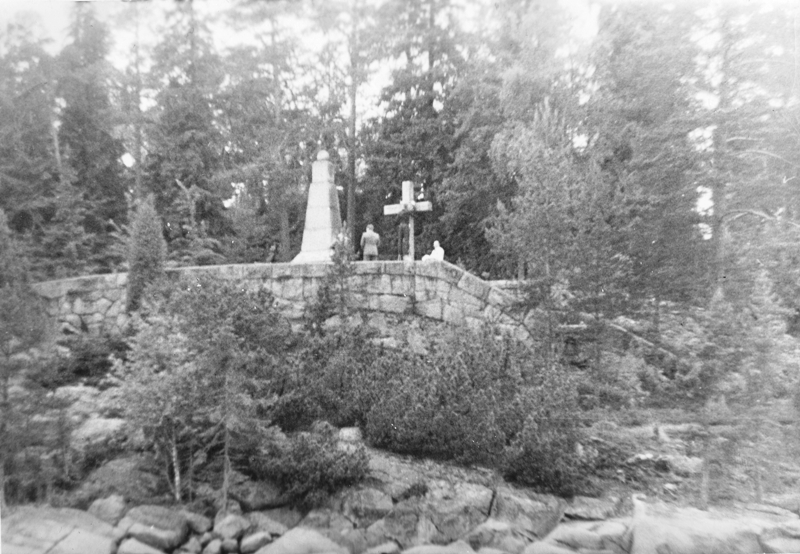 … Прошли годы, и установленный на месте погибших героев Гангутского сражения деревянный крест истлел, а могильный холм – сравнялся с землёй. Но в 1869 во время манёвров Кронштадтской учебной эскадры в Рилакс – фьорде, когда воспитанники Морского училища повторяли все действия русского и шведского флотов в ходе Гангутского сражения, начальник училища контр-адмирал В. А. Римский-Корсаков (старший брат великого композитора) отыскал это захоронение. По окончании манёвров, 16 июля, Римский-Корсаков, генерал-лейтенант граф Аминов – владелец местных поместий – с участниками учения сошли на берег и на предполагаемом месте захоронения погибших гангутцев поставили простой деревянный крест, сделанный матросами фрегата «Громобой».