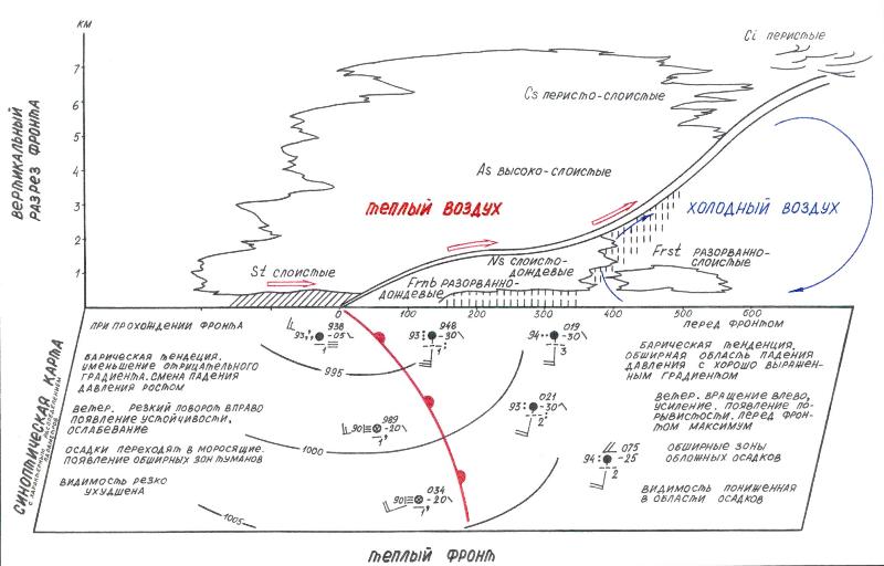 Как известно, холодные фронты характеризуются ветрами со скоростью 21-28 м/с (9-10 баллов), шквалами, ливневыми осадками перед холодным фронтом, обложными осадками за холодными фронтами и резким ухудшением видимости в зоне выпадения осадков. Внешними признаками непосредственного приближения атмосферного фронта являются изменение характера облачности, изменение направления и скорости ветра, выпадение осадков. Следует иметь в виду, что характерные облака - предвестники грозы не всегда появляются на небе с достаточной заблаговременностью .