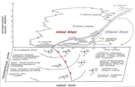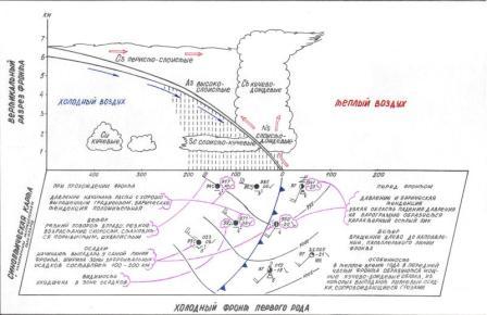 Непосредственно перед линией фронта возникает кучево-дождевые облака (СЬ), из которых выпадают ливневые осадки, сопровождаемые грозами. Ширина зоны ливневой облачности - несколько десятков километров.