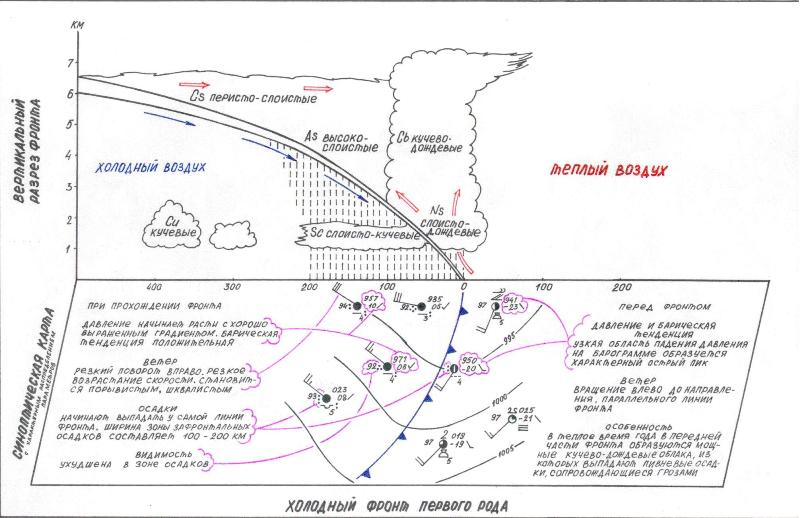 холодные фронты 1-го рода — медленно движущиеся фронты, у которых облачность и осадки располагаются в основном за линией фронта;