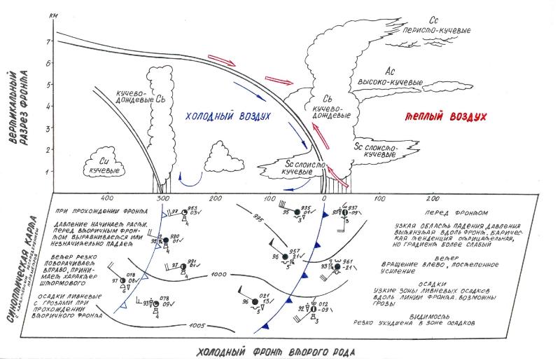 Холодный фронт 2-го рода отличается тем, что быстрое перемещение вала холодного воздуха вызывает перед линией фронта бурный подъем оттесняемого теплого воздуха, а нисходящие движения воздушных потоков препятствуют распространению облачной системы непосредственно за линией фронта. Быстро движущийся холодный фронт второго рода сопровождается выпадением осадков, вслед за которыми, при прохождении фронта, происходит усиление ветра с порывами и шквалами.