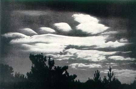 5. Небо начинает покрываться высокими облаками, которые как бы распространяются из одного места у горизонта (обычно с юга или запада). Затем облачность увеличивается и уплотняется. Постепенно все небо затягивается облачным слоем, сквозь который просвечивают солнце и луна. Уплотнение облачности, предвещающее ненастье, происходит слева от наблюдателя, когда он смотрит по направлению ветра.