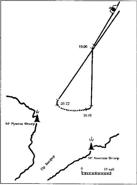 | Схема постановки мин подводным минным заградителем «Краб» у Босфора 27.06.1915г. |