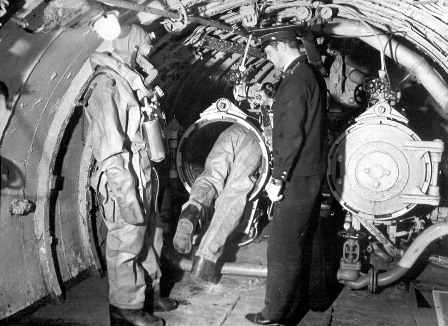 Первые опыты успешны, и мы начали относиться к этим занятиям без пиетета, теряя чувство нового. Очередным этапом был выход из торпедных аппаратов - это были штатные 533-мм ТА, снабжённые иллюминаторами для наблюдения за подопытными. В него помещаются три человека, снабженные металлическими кольцами для подачи сигналов о самочувствии и готовности к работе.