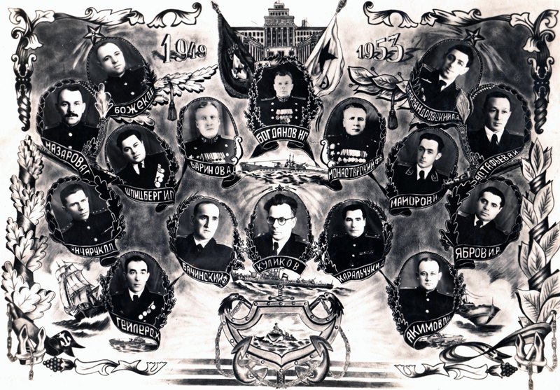 - капитан 1 ранга Бачинский Ф. - начальник кафедры Морской практики. Бывший командир посыльного судна «Красный Вымпел». Особенно летом офицеры этой кафедры истово учили курсантов премудростям морского дела. Сейчас курсанты не знают, что такое шестнадцати весельный баркас, у нас он был основным плавсредством. Особо виртуозно баркасом под парусом управлял мичман Мальчиков, инструктор с этой кафедры. В зачет по ГТО на втором курсе входил 2-х суточный поход.