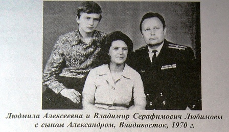 Владимир Серафимович Любимов родился 5 марта 1930 г. в г. Таганроге Ростовской области. В 1938 году родители Володи с тремя детьми переехали на постоянное место жительства на ст. Ерофей Павлович Амурской области (ранее эта станция входила в состав Читинской области). В 1946 году смышленый подросток заканчивает 7 классов. Учился он неплохо. В свидетельстве об окончании семилетки по многим предметам стояли оценки «отлично». Стремление стать моряком у Володи зародилось еще в 5 классе, когда рассказы заезжего курсанта-отпускника ДВИМУ им. Г.И. Невельского и красивая морская форма, в которой он щеголял в отпуске, взбудоражили подростка. Хотел поступить в школу юнг, но попытка поступить в нее не удалась - близилось уже окончание военного лихолетья. В 6 классе пятнадцатилетний подросток услышав о том, что после семилетки во Владивостоке набирают воспитанников в подготовительное ВМУ, Володя стал более серьезно относиться к учебе. И вот его мечта сбылась! В 1946 году он поступает во Владивостокскую «подготу». Ниже кратко даны биографические данные Владимира Серафимовича (в основном, о его служебном пути).